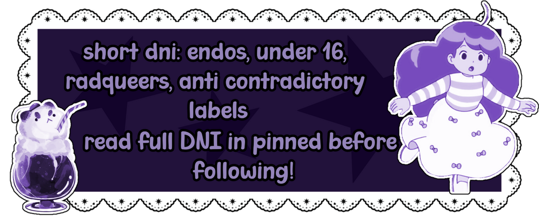 - do not infantalize me or hyper infantalize our littles (if you ever meet them)- tone tags are super helpful for us, we are autistic and misunderstand tone quite frequently!- im ok with and love to see fanart/edits of my ocs- shipping my ocs is also fine just make sure its not a proship and also make sure it doesn't erase the ocs canon sexuality- dont comment on my voice, I'm well aware I sound like a 12 year old- flirting with me is fine as long as ur no more then 2 years from my age (joke or not) ill most likely do it back lmao- dms are always open, start a convo with me i love talking to people :]- do not criticize my art/edits or interests- don't be weird about our introjects, they are real people, not characters.- only ask about personal info if we are close